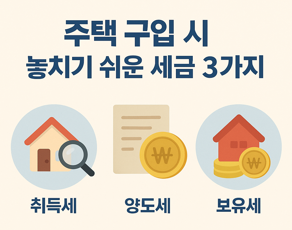 집을 구입할 때 가장 중요한 요소는 '매매가'이지만, 실제로는 세금이 전체 비용에 큰 영향을 미칩니다. 특히 취득세, 양도세, 보유세는 주택 구입 전후로 반드시 고려해야 할 필수 항목입니다. 이 글에서는 주택 구매 시 발생하는 주요 세금 3가지의 구조, 계산 방식, 실수하기 쉬운 부분과 절세 팁까지 초보자도 이해할 수 있게 정리했습니다.